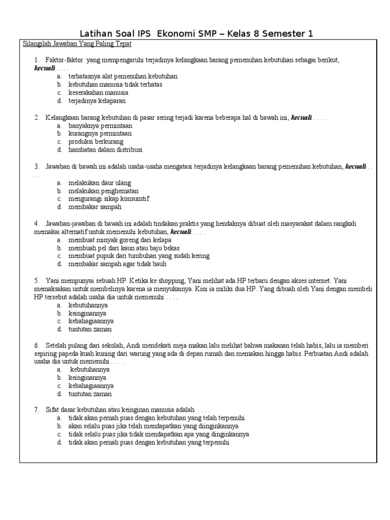 Jul 31 2019 Total Attempts. Pada tulisan kali ini kita akan sajjikan latihan soal IPS kelas 7 SMP MTs semester 2 genap bab 3 yaitu Kegiatan manusia dalam Memenuhi Kebutuhan.