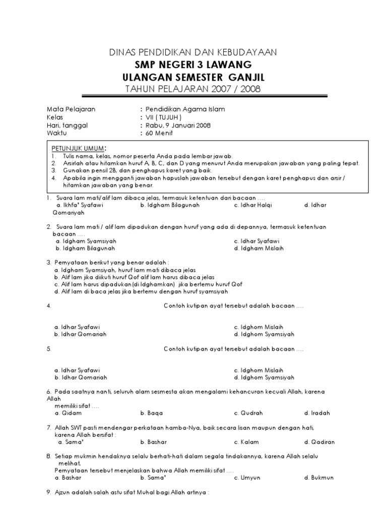 Kami akan tampilkan beberapa contoh soal ipa tersebut agar anda Read More. Soal PTS Agama Kristen SMP Kelas 7 Semester 2 kurikulum 2013 adalah artikel yang akan kami bagikan pada kesempatan kali ini. Soal Agama kelas 7 Pendidikan agama islam adalah salah satu pelajaran yang sejak dulu di ajarkan oleh para Nabi yang dimana mengajarkan tentang dari mulai membaca Al-quran dan yang lain sebagai nya Sehinggga hal ini dapat di amalkan dalam kehidupan sehari-hari untuk mendidik anak-anakMaka kami akan memberikan Soal agama kelas 7 dengan harapan dapan dijadikan.